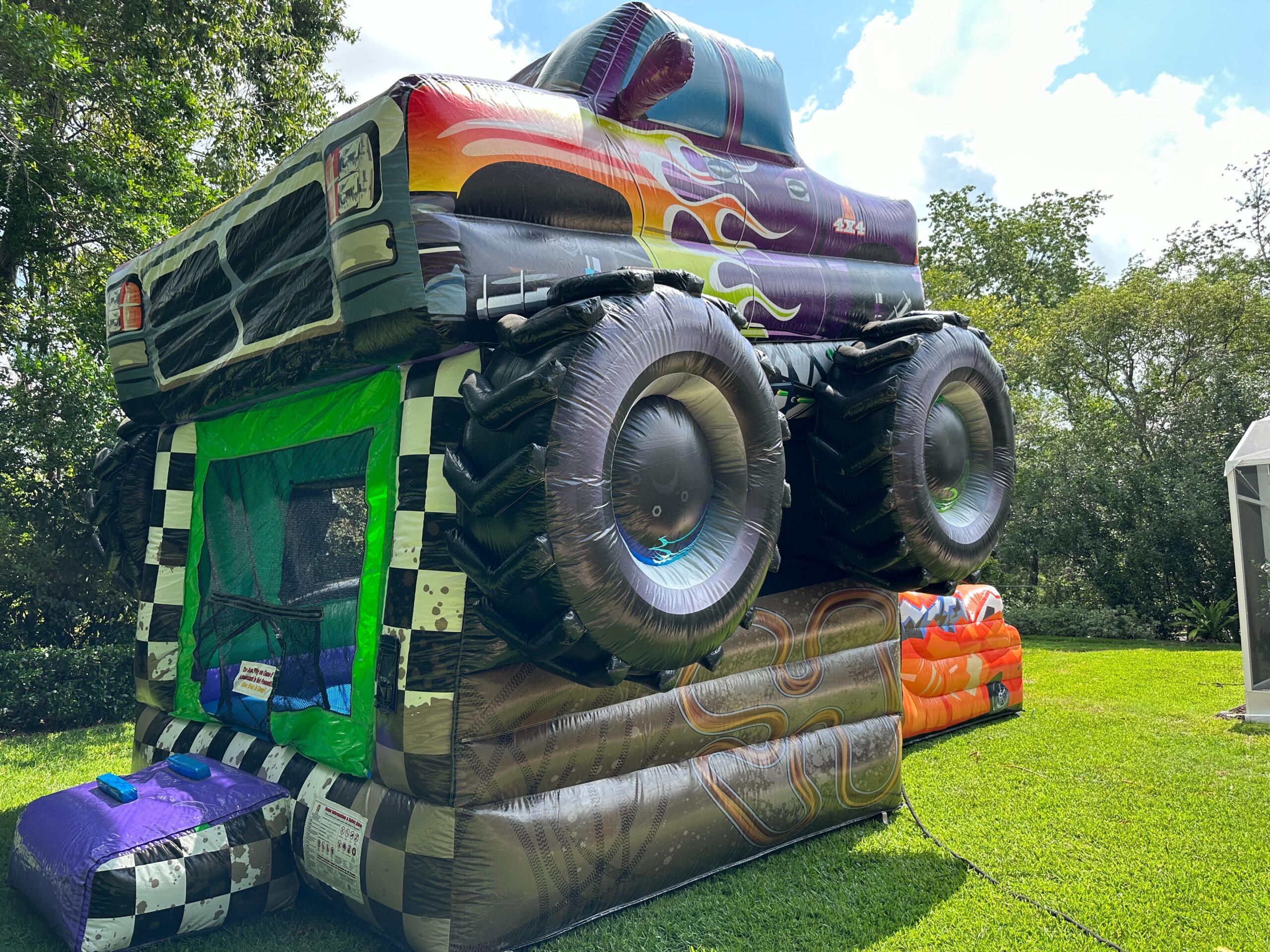 The Monster Truck Bounce House and Slide Combo is the perfect inflatable rental for any kid’s birthday party!  Watch your child’s eyes light up when they see this gigantic Monster Truck rolling up in the yard!  Your child’s imagination will soar with the sounds of a revving engine and dirt flinging in the air!  Take a tour of a real Monster Truck Rally by going in this Monster Truck Bounce House and Slide Combo!  It’s like you are at Monster Jam!