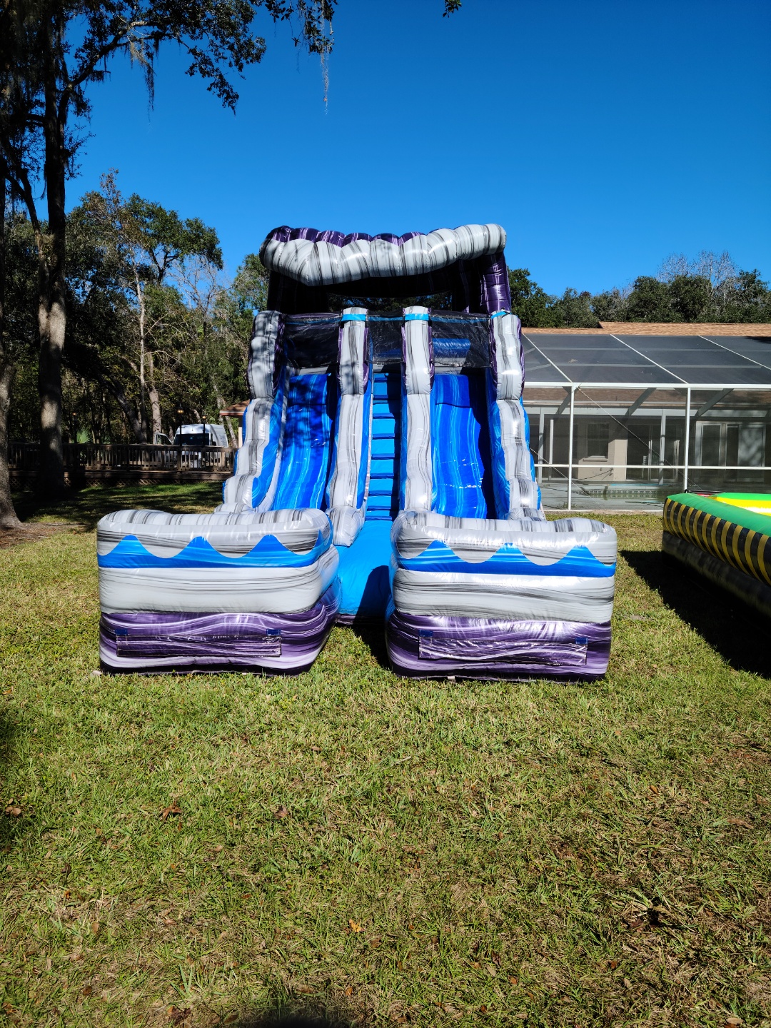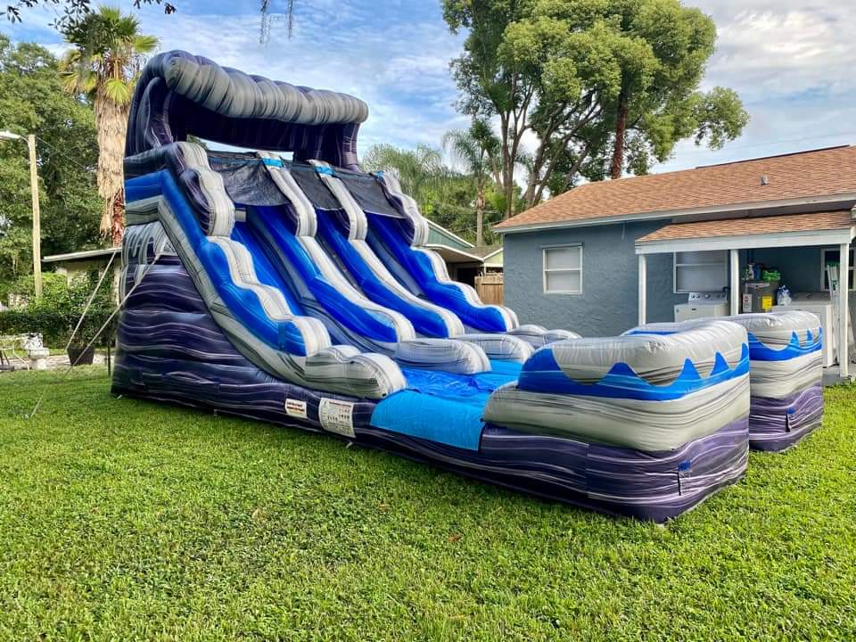 Go under the sea with this beautiful Purple Marble Slide! You can now swim, float, and explore under the rapid waterways on a grand adventure! Trek up the 18-foot-tall steps that lead to the top of the world. Overlook this beautiful body of water from the peak. Then splash down at exhilarating speeds into a pool of clear blue water! This beautifully vibrant, Purple Marble Slide appears as a giant, cresting wave. Use this at birthday parties, beach parties, Disney’s Little Mermaid-themed parties, and more!