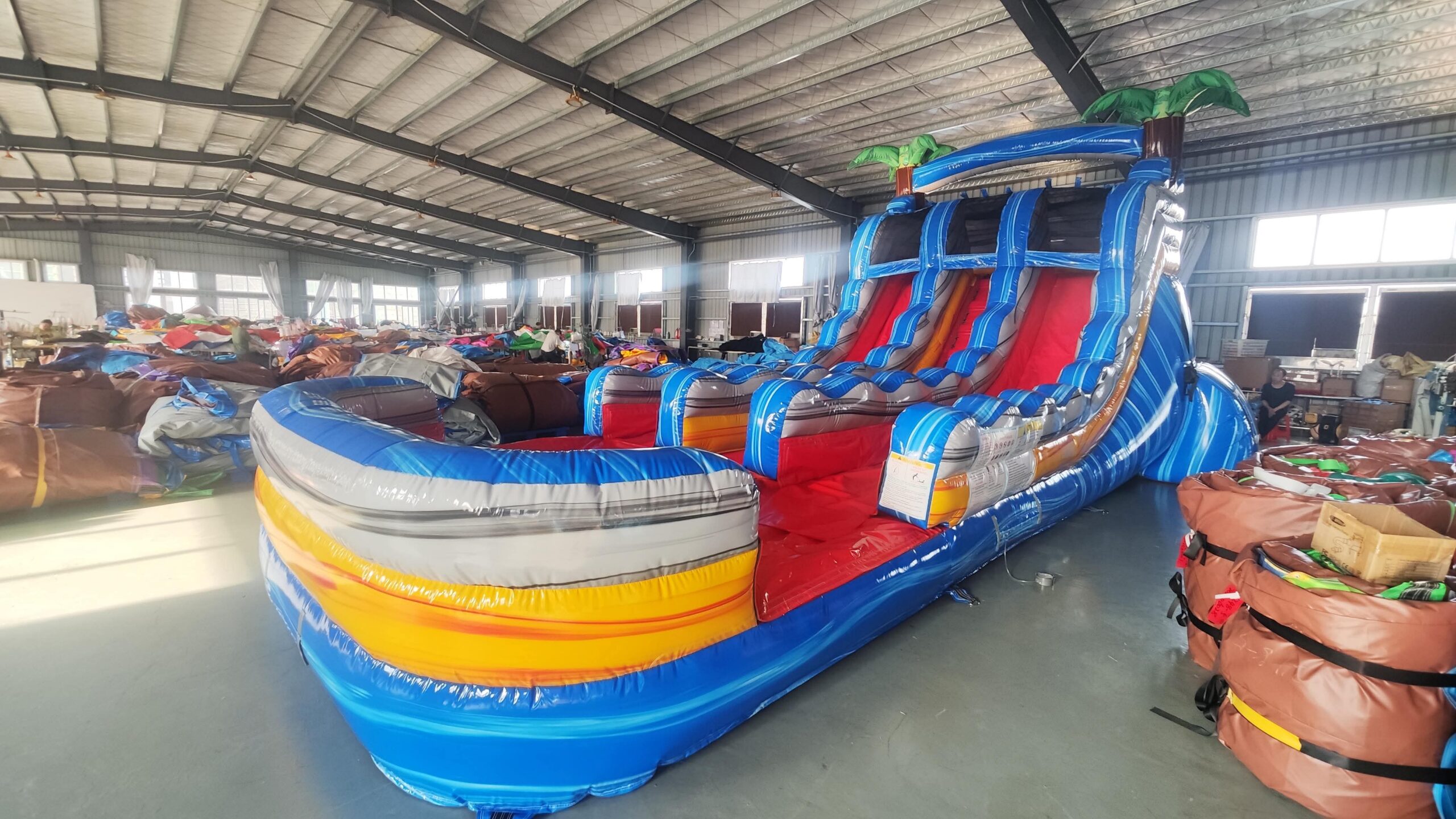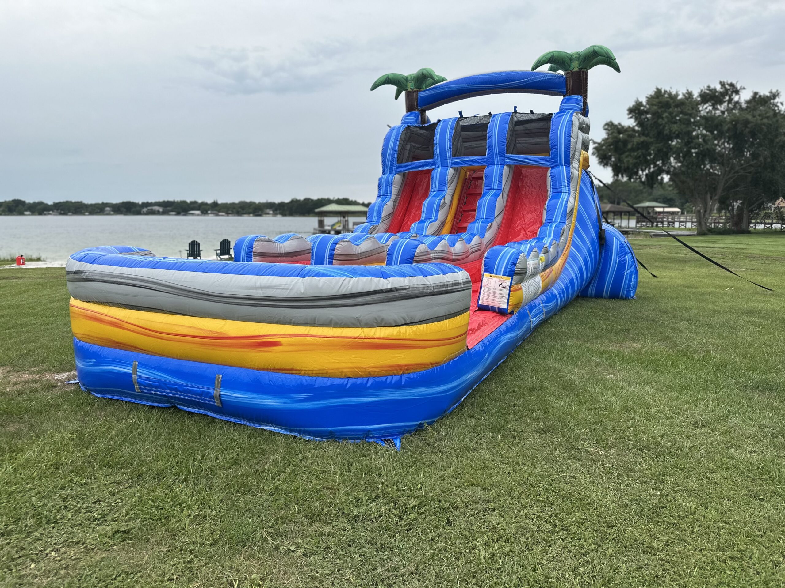 The Tropical Fire Waterslide from Captain Carnival adds thrill to any event. Its tropical design shines with blue, yellow, and red hues. Additionally, palm trees sit on top, making it a festive choice. With all of its detail, you may just think you’re on the shores of the Bahamas! This exciting inflatable waterslide suits birthdays, family gatherings, or summer bashes perfectly. Two lanes let friends race side by side for extra fun. Meanwhile, the climb up uses sturdy steps with strong handles for safety. At the peak, sliders see a great view before they slide down. Moreover, steep, slick lanes give a fast, smooth ride every time. Red lanes stand out against the blue and yellow base. Thus, this creates a bold, eye-catching look for your party.