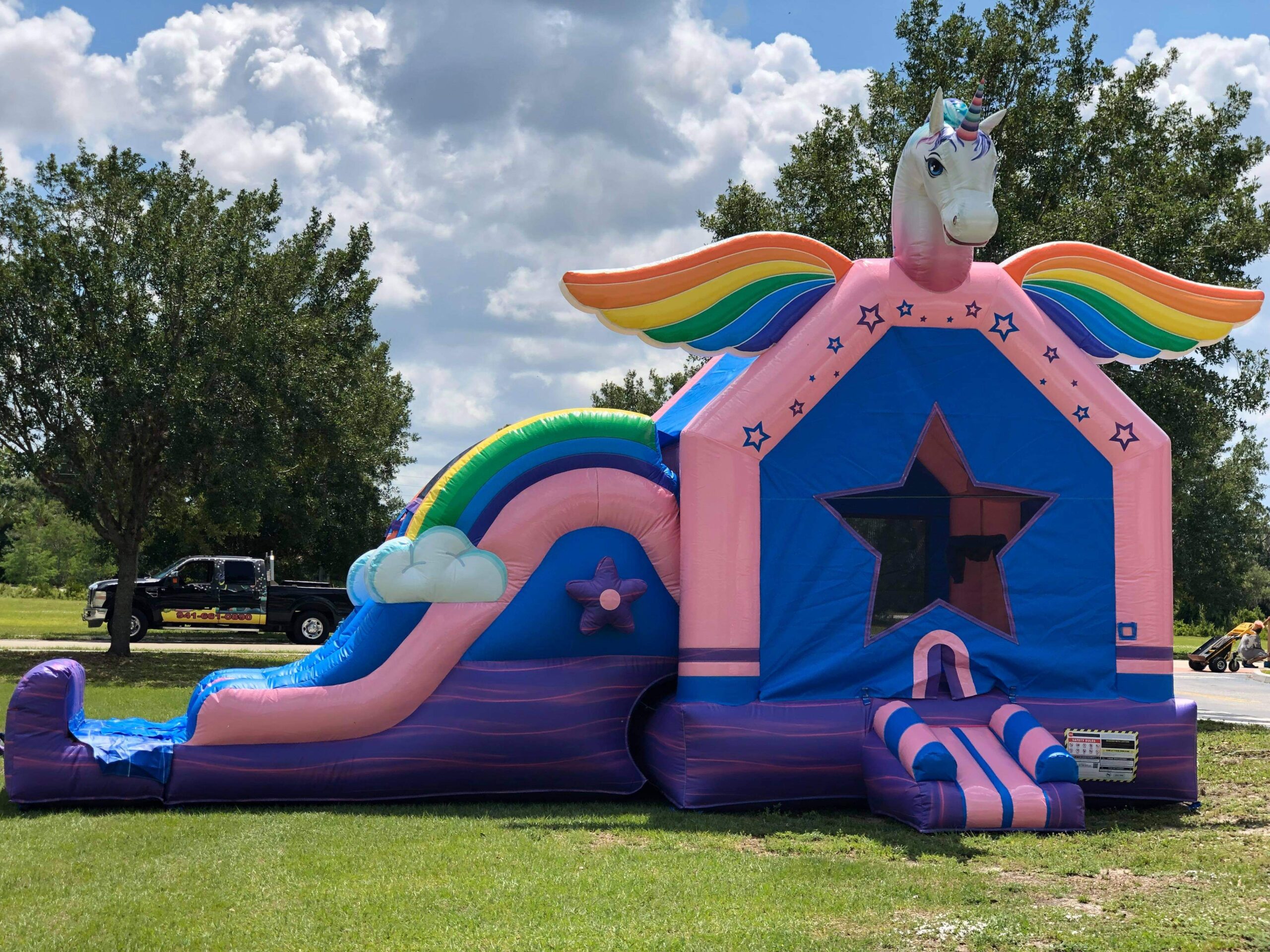 Unicorns are real, and the proof is here! This Unicorn Bounce House and Slide Combo will lead to the most magical adventure you’ve ever had! Climb up the candy-stripped ramp with cotton candy rails. Enter into this wondrous world through the star chamber. Your fairy tale dreams come to life inside, with bright, beautiful colors and a bouncing area the size of clouds! The rainbow-winged unicorn will watch over you as you bounce throughout its home! Inside you will discover a tall wall to climb up to be above the clouds! From there, you will glide down the rainbow slide into an imaginary blue sky! Your free-falling adventure awaits! And if you get scared, just remember that the unicorn with the rainbow wings is watching over you!
